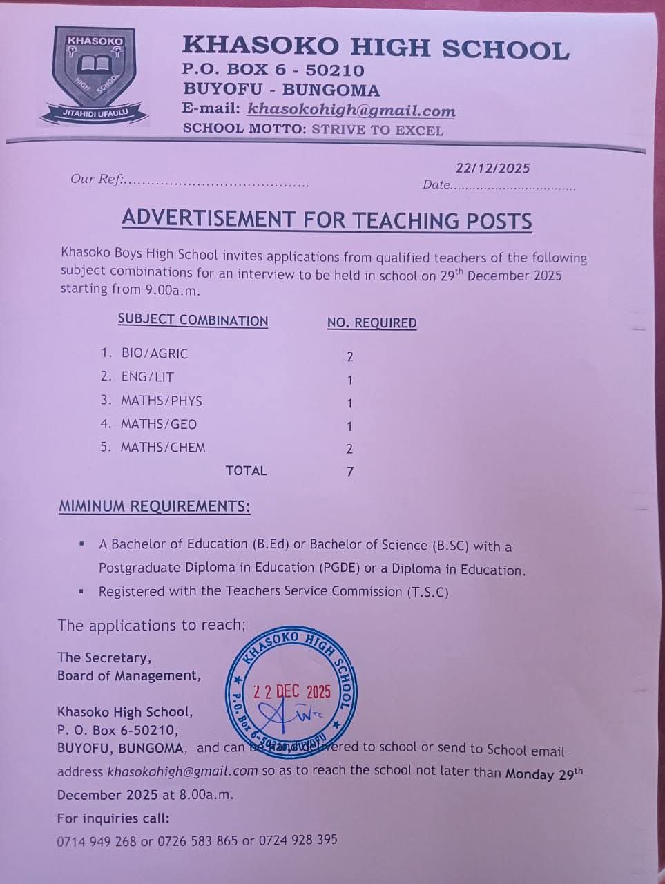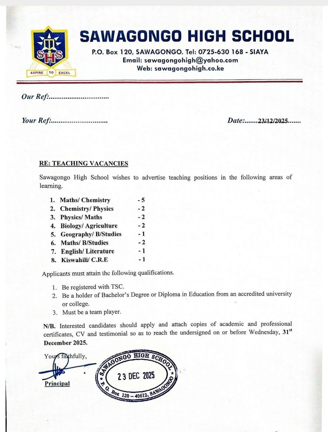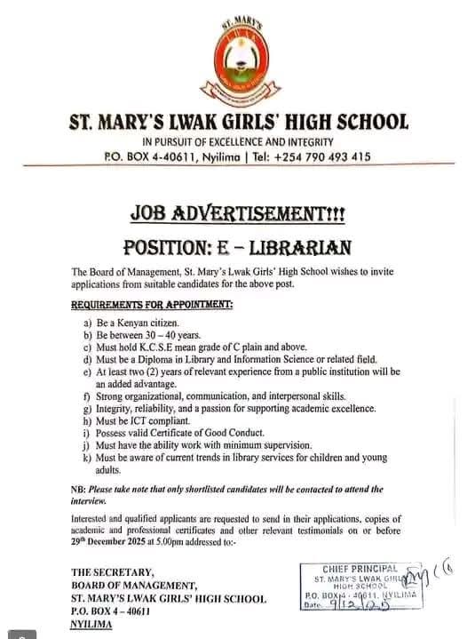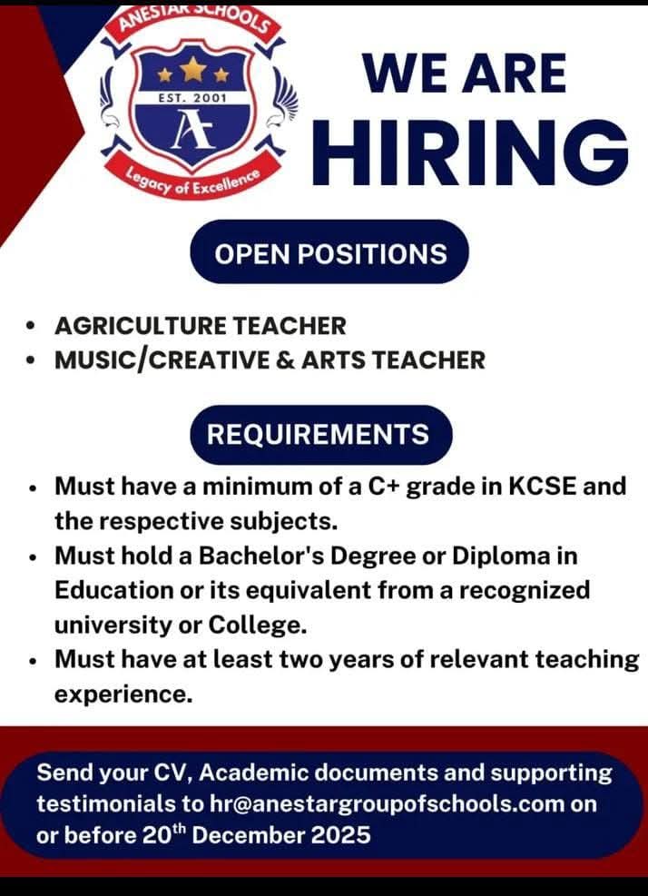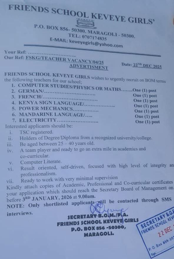 Those interested and qualified to forward their applications by 9/01/2025 and be ready to start teaching from 13/01/2025.