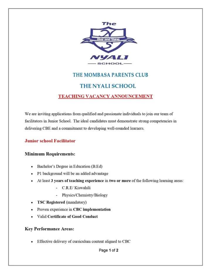 2026 BOM TEACHING VACANCY AT THE NYALI SCHOOL