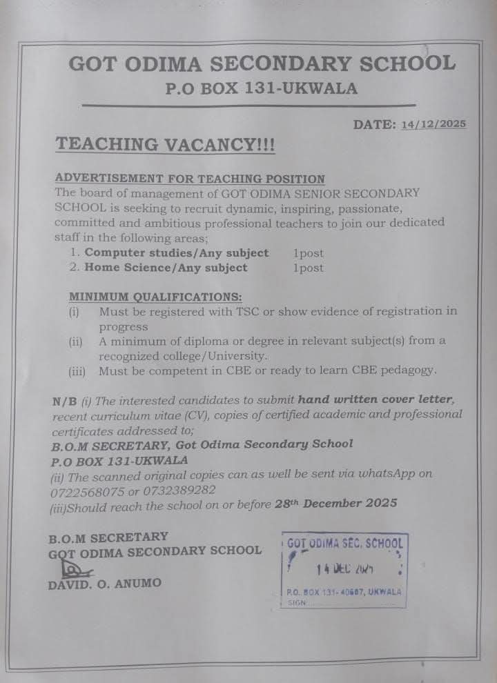 2026 BOM TEACHING VACANCY AT GOT ODIMA HIGH SCHOOL