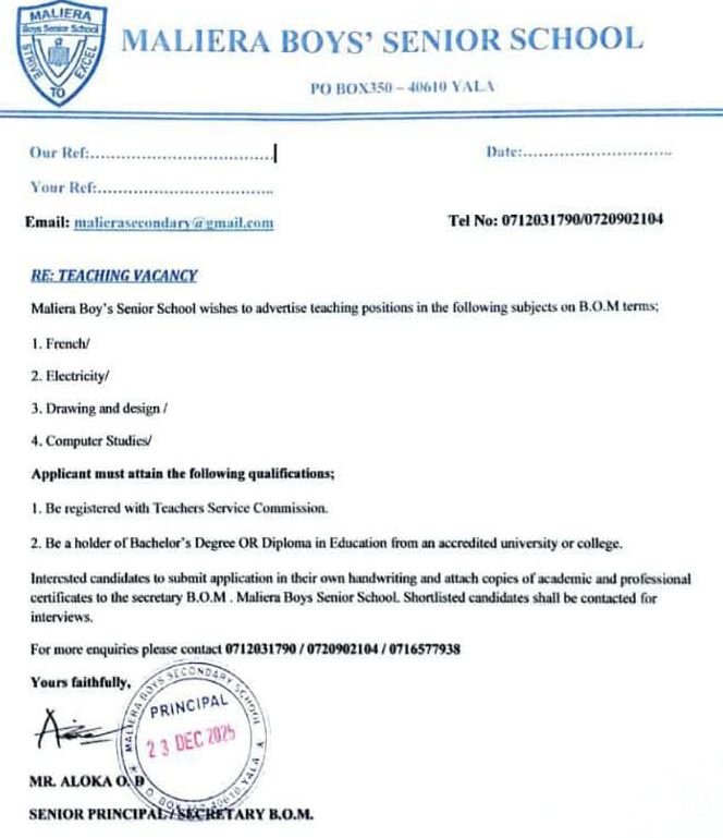2026 BOM TEACHING VACANCY AT MALIERA BOYS’ HIGH SCHOOL