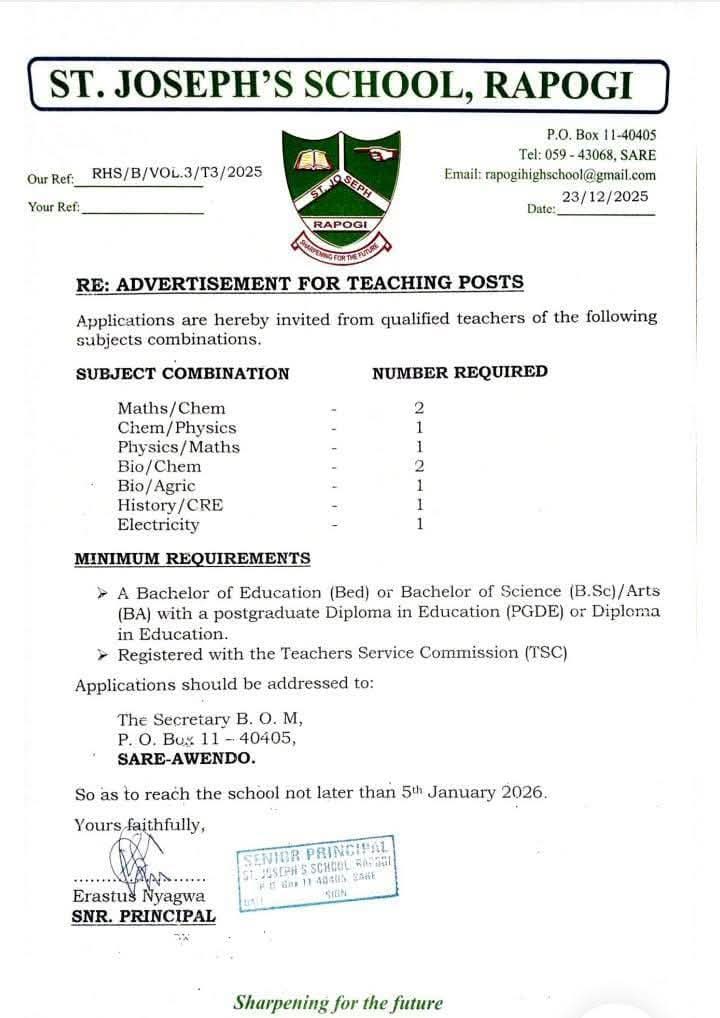 TEACHING VACANCIES AT ST. JOSEPH’S SCHOOL, RAPOGI